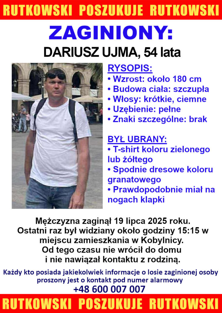 W niedzielę 27 lipca 2025 roku o godzinie 14:30 w Słupsku odbył się briefing prasowy zorganizowany przez Biuro Rutkowski oraz Telewizję Patriot24.net. Tematem spotkania było zaginięcie 47-letniego mieszkańca Kobylnicy – Dariusza Ujmy, który zniknął bez śladu 19 lipca br. W briefingu wziął udział Krzysztof Rutkowski, który prowadzi działania poszukiwawcze, a także żona oraz siostrzenica zaginionego….