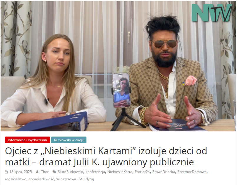 Biuro Rutkowski i Telewizja.Patriot24.net organizują spotkanie dla dziennikarzy dotyczące celowego izolowania małoletnich dzieci – Antoniego, lat 3 i Stanisława, lat 4, od ich matki, Julii Kowalskiej. Ojciec chłopców, mieszkaniec Włoszczowy, Artur, lat 51, od 3 miesięcy skutecznie pozbawia matkę kontaktu z dziećmi bez jakiegokolwiek uzasadnienia. Sytuacja jest tym bardziej dramatyczna, że mężczyzna ma założone 3 niebieskie karty…