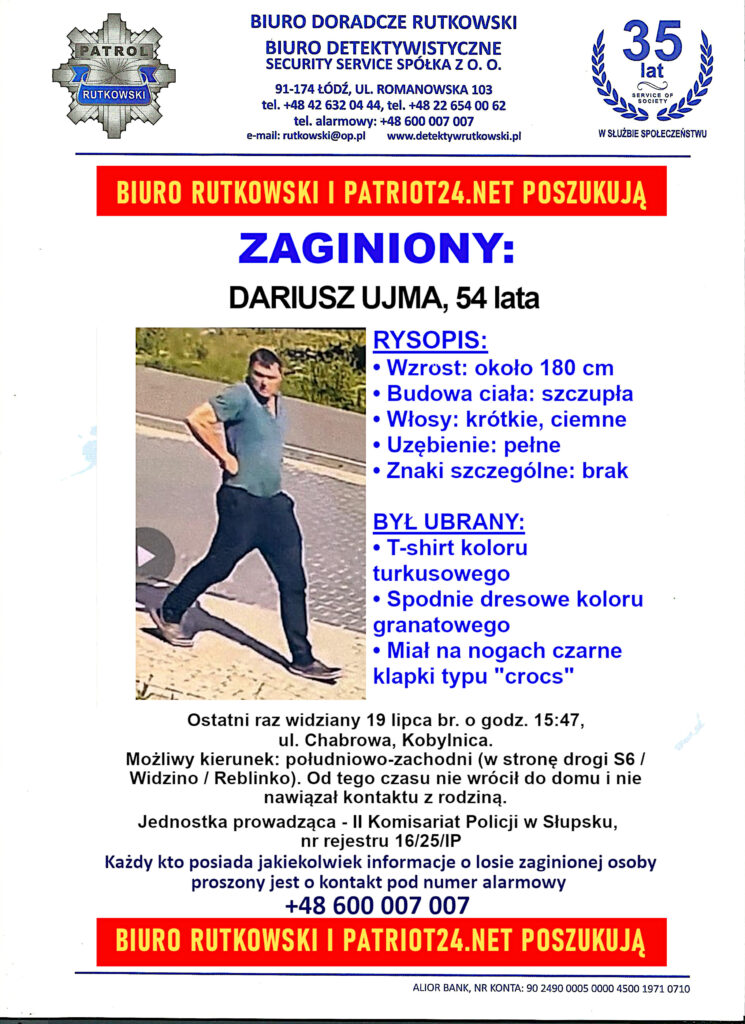 W związku z pojawieniem się nowych, istotnych informacji, które mogą przyczynić się do skutecznego odnalezienia zaginionego Dariusza Ujmy, Biuro Rutkowski i Telewizja.Patriot24.net organizują w dniu 2 sierpnia 2025 r. o godzinie 15:00 briefing prasowy przy Komendzie Miejskiej Policji w Słupsku, Al. 3 Maja 1. Wszelkich informacji udziela bezpośrednio Krzysztof Rutkowski pod numerem 512 058 370….